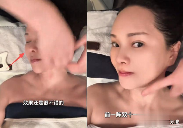 对比一下,她没护脸时和做完之后的状态,脸部虽然肉眼可见的变亮变干净了一些。